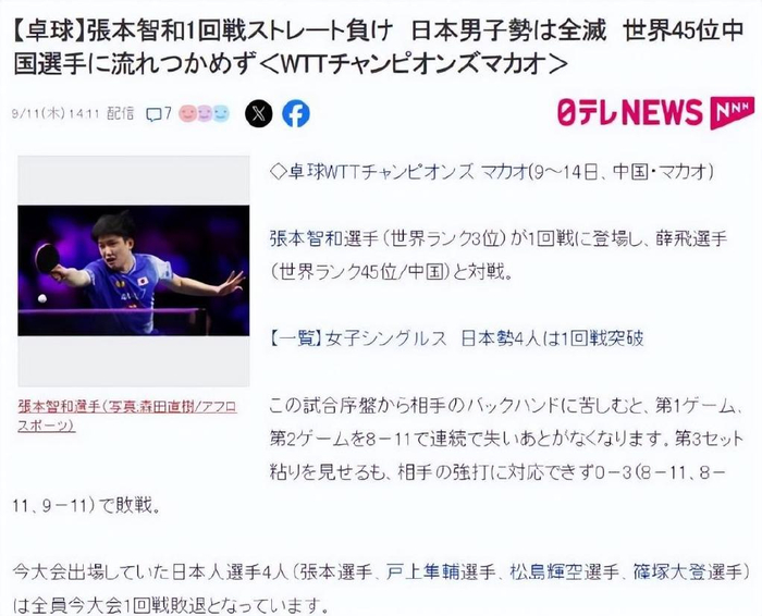 张本智和则是把自己的败因归结于未能适应薛飞独特的直板打法,张本智和认为,薛飞的击球角度变化难以应对,特别是反手技术极具特色,自己本计划对薛飞进行压制,但是并未成功。随后张本智和还表示,这是今年第二次输给薛飞,但这一次首局被逆转后就进入颓势了,每局都形成纠缠,薛飞在关键时刻更加冷静。通过薛飞与张本智和的表态就可以知道,除了技战术外,心态成为了这场比赛胜负的关键,薛飞在关键时刻比张本智和更加冷静。日本媒体在报道中更是无奈表示,张本智和被薛飞的反手压制,第三局虽顽强抵抗,但仍未能招架薛飞的强攻。同时日媒也指出,日本男单在本站比赛全军覆没,张本智和,户上隼铺,松岛辉空,筱冢大登全部止步首轮。